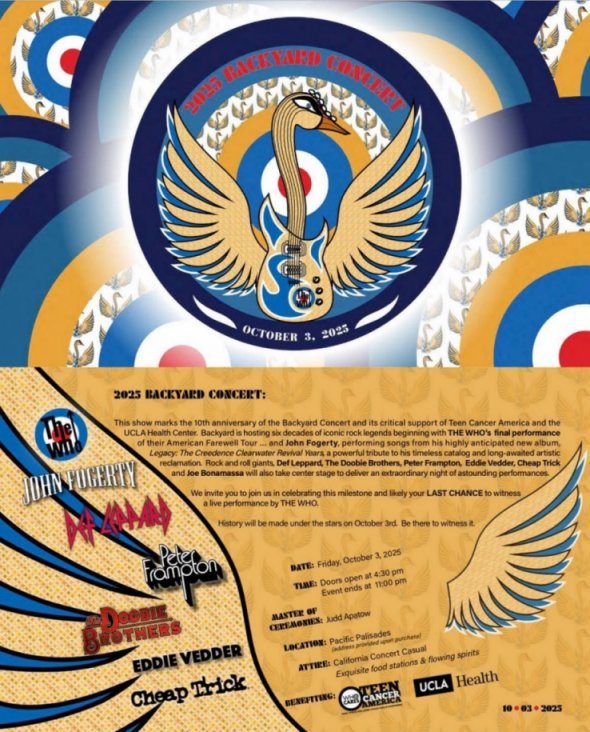 As mentioned The Who are hosting their '2025 Backyard Concert' at a private residence in the Pacific Palisades area near Los Angeles on 3rd October.