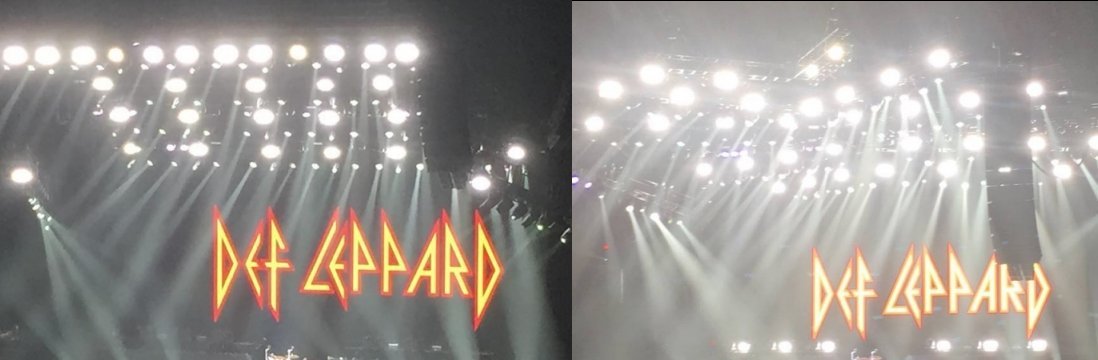 As mentioned Rick's drum riser now includes sections of LED video wall. Closer inspection of the lighting rig reveals it is quite different to the one used before this tour leg or at least differently arranged. As shown in the comparison photo below using shots from Sunrise (left) and Pensacola (right) at the end of the shows.